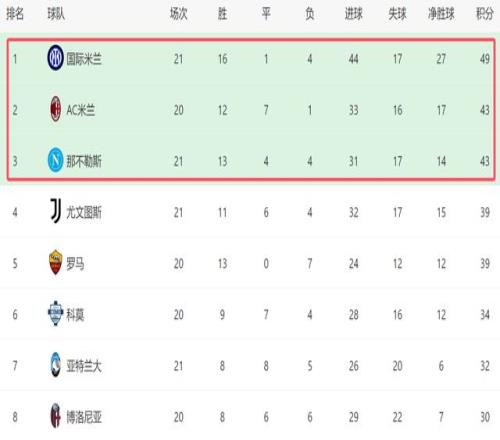 虽然尤文争冠基本出局,但是依然还有2个对手能威胁国米,他们分别是AC米兰和那不勒斯。本轮比赛,AC米兰将在主场迎战莱切,如果能战胜对手,他们和国米的差距就将缩小到3分,再加上AC米兰无需分心欧战,下半赛季的体能优势,随时会帮助AC米兰逆袭。