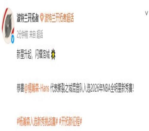 据NBA波特兰开拓者队官方微博1月27日消息,中国球员杨瀚森代表撕裂之城混音队入选2026年NBA全明星新秀赛!