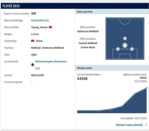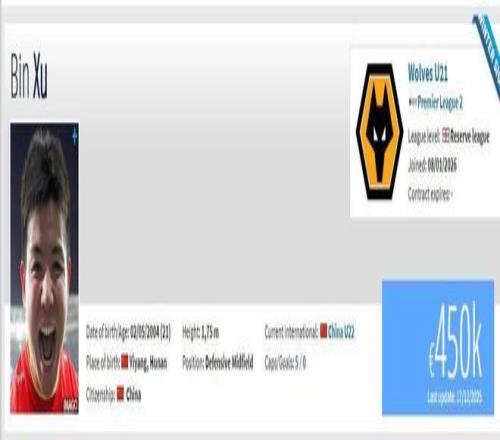 1月8日,徐彬正式加盟英超狼队,身价45万欧元