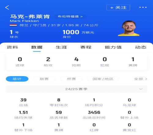 弗莱肯现年31岁,荷兰门将,本赛季代表布伦特福德各赛事出场39次,零封8场。目前球员德转身价为1000万欧元。