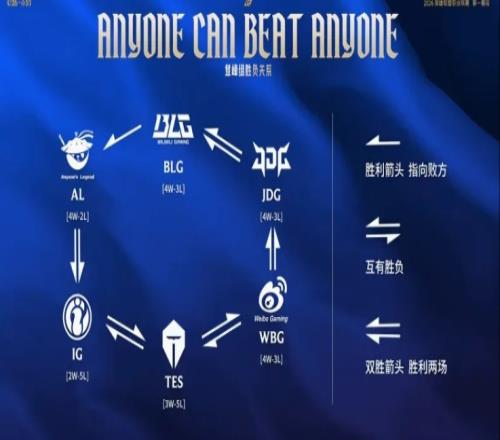 体育播报1月31日宣 在今天官方直播流给出的数据图中,登峰组六支战队已经形成了胜负闭环,其中AL双杀IG;WBG双杀JDG;JDG双杀BLG。