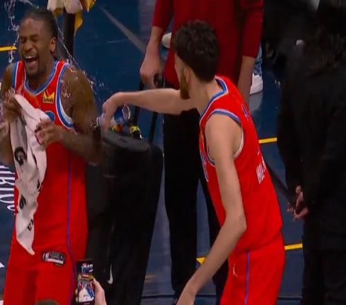 单场7三分&27分皆生涯纪录!霍姆格伦场边泼水华莱士庆祝其生涯夜