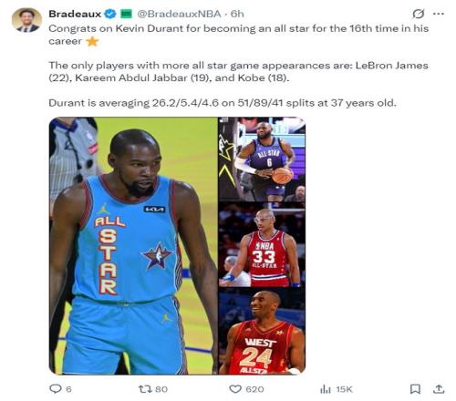 火记Bradeaux写道,杜兰特生涯第16次进入全明星,杜兰特全明星次数历史第四,仅次于詹姆斯22次,贾巴尔19次,科比18次。